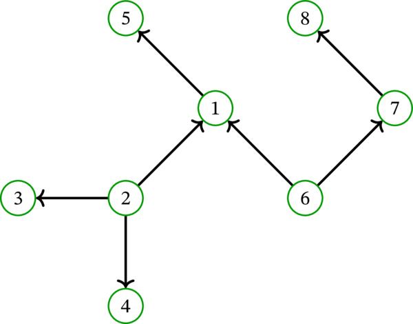 このグラフは \(6\) を根とする有向木である。実際、\(6\) から各頂点への路が存在し、弧を無向辺にすると木が得られる。