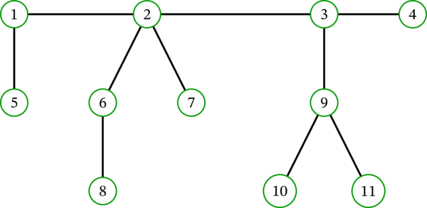 このとき補題 5.5.10 における集合 \(L\) は \(\left\{ 4,5,7,8,10,11\right\} \) であり、木 \(T\setminus L\) は次のグラフとなる: