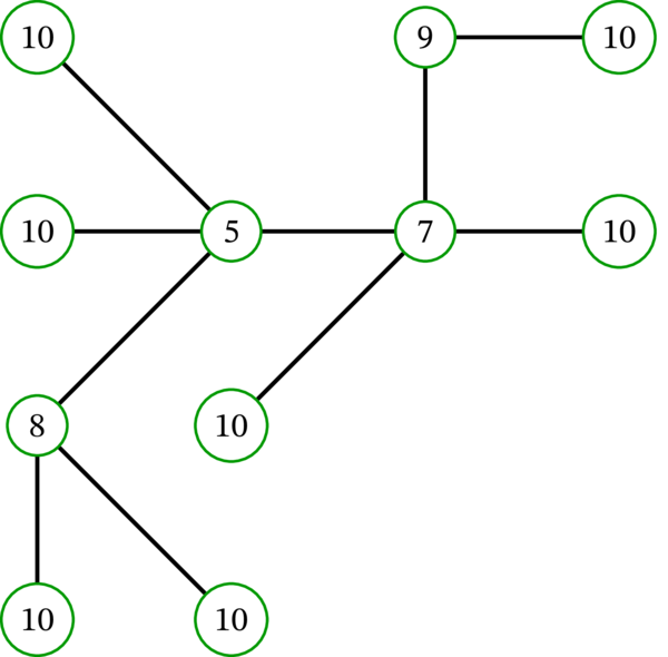 [例: 各頂点に \(c_{v}\) の値を示すラベルを付けた木 \(T\) の例を示す: