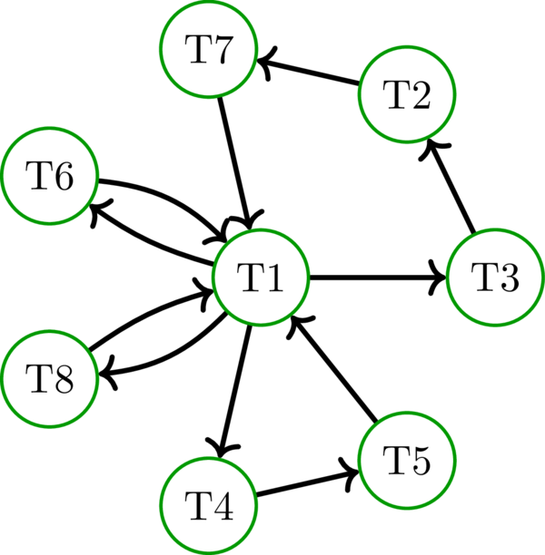 この有向グラフの \(\text{T}i\) から \(\text{T}j\) への弧は \(\text{T}i \Longrightarrow \text{T}j\) という命題を表す。この有向グラフは強連結 (任意の \(\text{T}i\) から任意の \(\text{T}j\) に弧をたどって到達可能) なので、その弧に対応する命題を全て証明すれば定理 5.2.4 が証明できる。