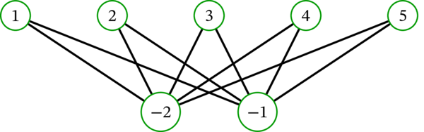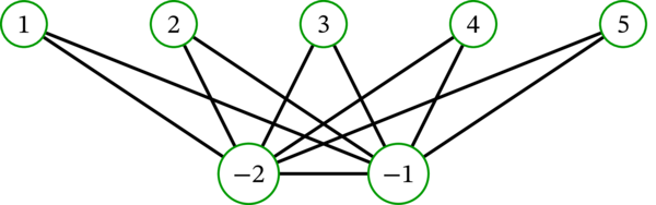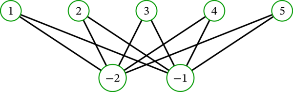 そして、\(K_{n,m}\) の任意の頂点 \(i\), \(j\) は両者が逆の符号を持つとき、かつそのときに限って隣接する (任意の正の頂点は全ての負の頂点と隣接し、同じ符号の頂点同士は隣接しない)。