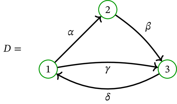 \(\mathbb{K}\) を可換環とする。それぞれの弧 \(a \in A\) に要素 \(w_{a}\in\mathbb{K}\) が割り当てられると仮定する。この \(w_{a}\) を弧 \(a\) の重み (weight)と呼ぶ (\(\mathbb{K}=\mathbb{R}\) で重みは実数だと思って構わない)。