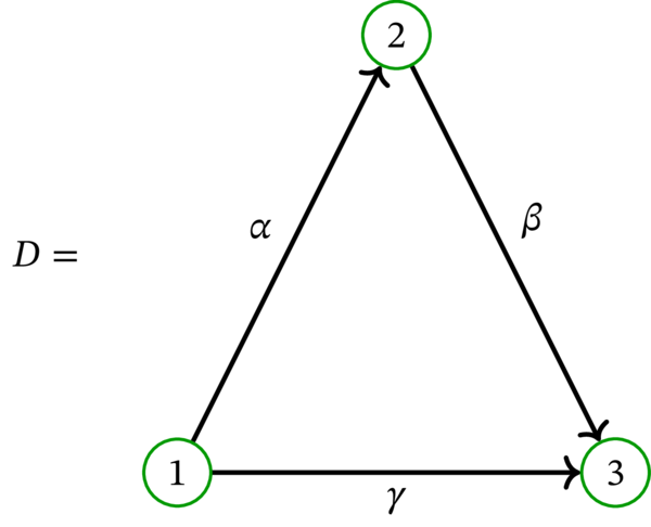 そして \(r = 3\) とする。このとき \(r\) を終根とする \(D\) の全域有向木は二つ存在する: 弧 \(\alpha\), \(\beta\) を持つものと、弧 \(\gamma\), \(\beta\) を持つものである。前者の重みは \(w_{\alpha}w_{\beta}\) で、後者の重みは \(w_{\gamma}w_{\beta}\) だから、次の等式が成り立つ: