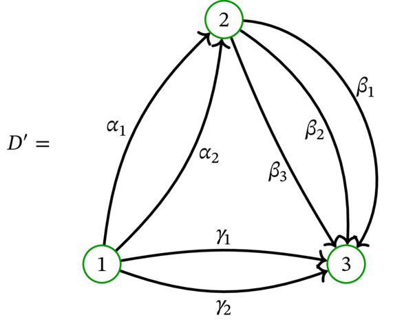 \(D\) の各弧 \(a\) を、\(w_{a}\) 個の \(a\) のコピー (\(a\) と同じ始点と終点を持つ弧) で置き換えたグラフ \(D^{\prime}\) を考える。この例を示す: