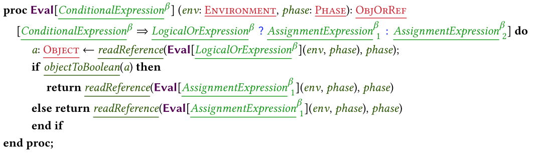 二度の ES4 の試みは ES1–ES3 の疑似コードを捨て、新しい形式化を採用した。Waldemar Horwat は ES41 のために以前より手の込んだ仕様言語を開発した。彼の仕様言語で書かれた ConditionalExpression の意味論 [Horwat 2003a] を次に示す: