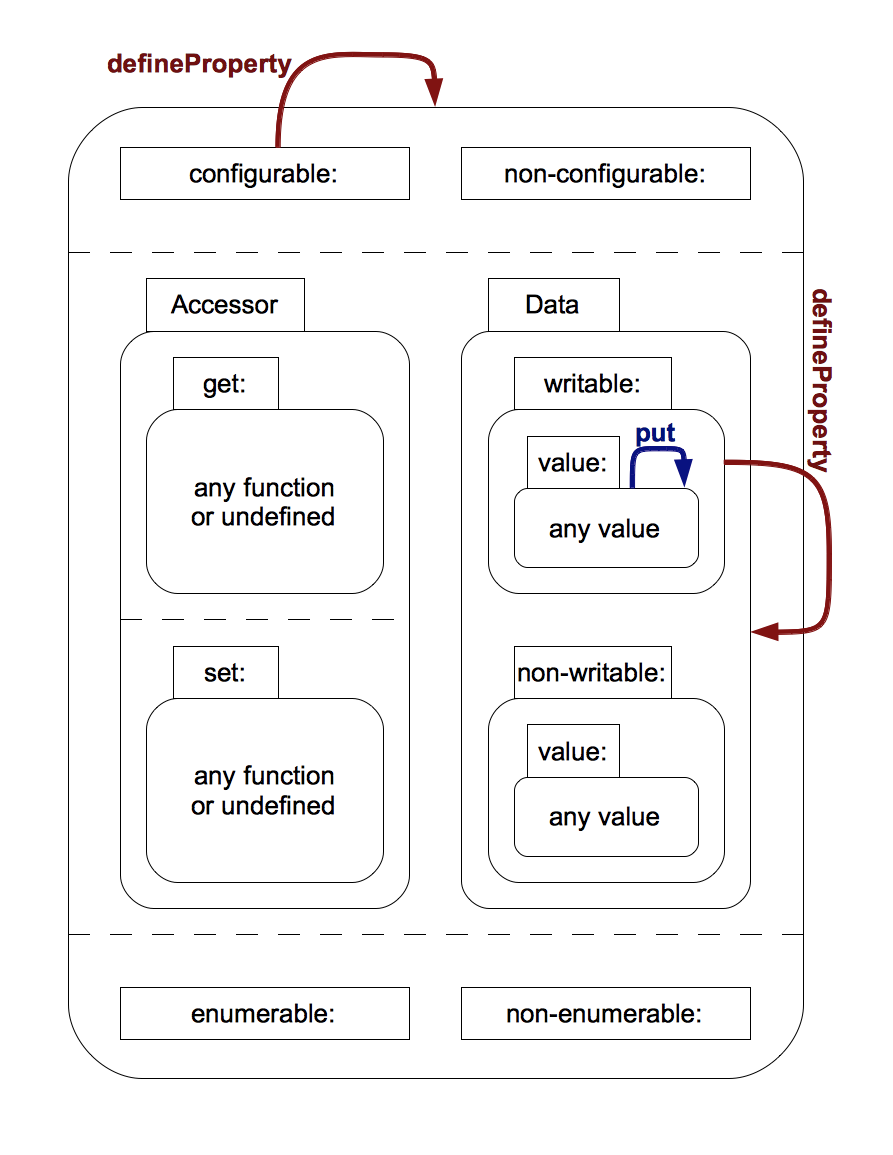 Allen Wirfs-Brock は様々なプロパティ属性に対応するプロパティを持つ記述子 (descriptor) オブジェクトを使うことを提案した。この記述子はプロパティ属性と取得の両方に利用できる。Wirfs-Brock による第 1 ドラフト提案5には obj というオブジェクトにプロパティを加える API として考えられる選択肢の一つが示されている: