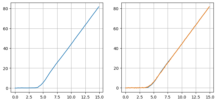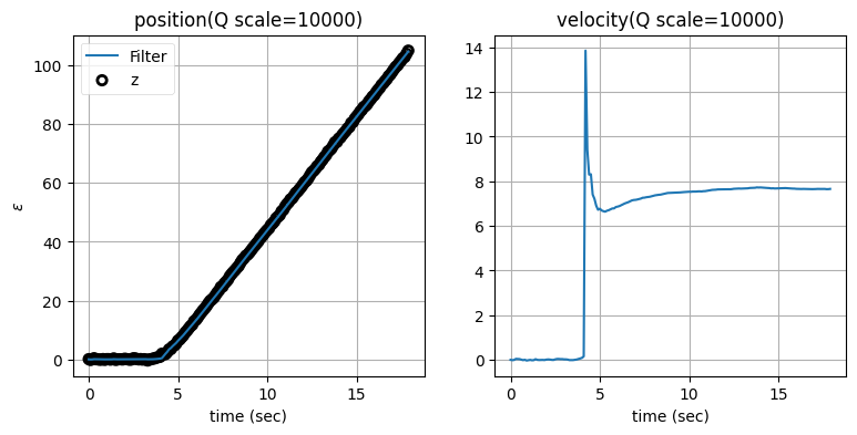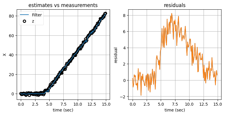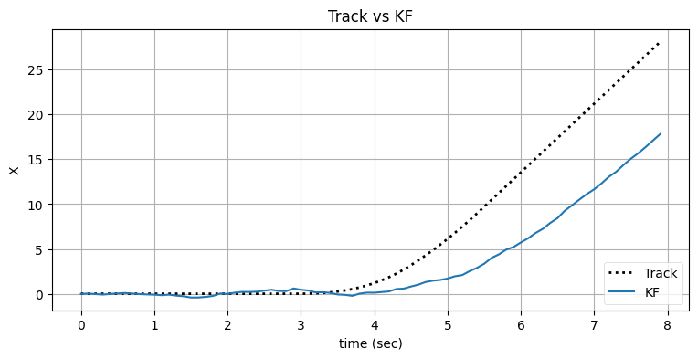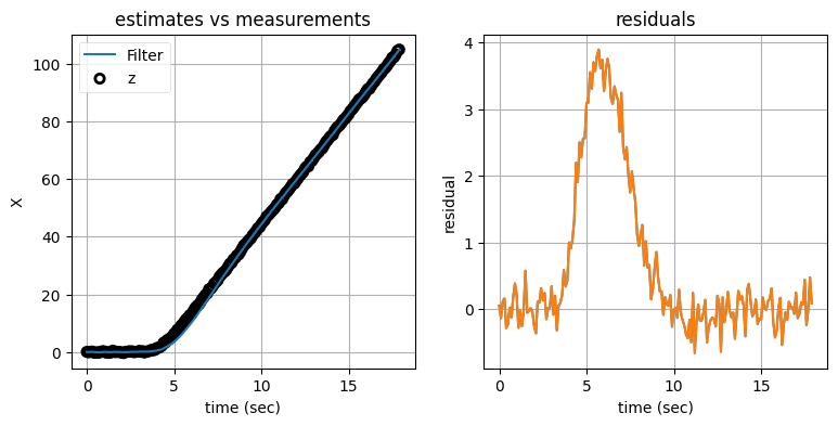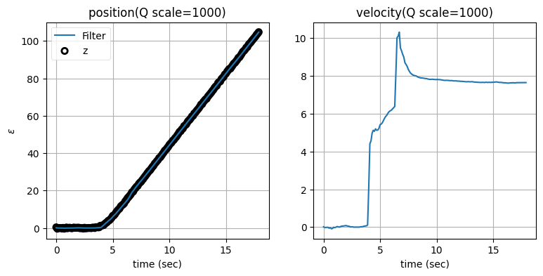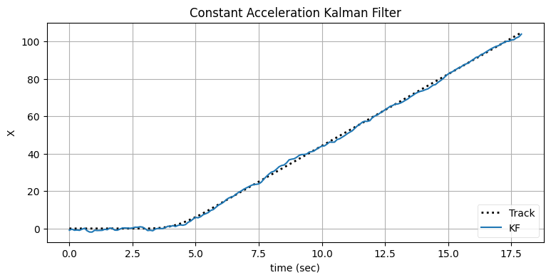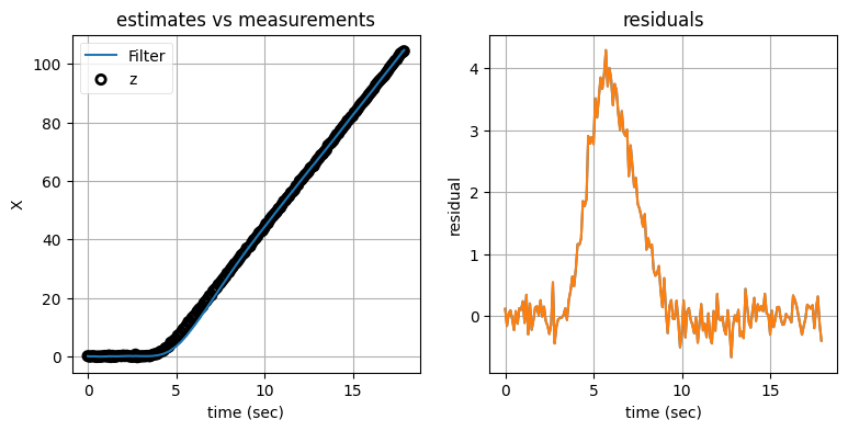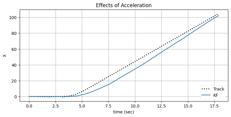 一つ例を見せよう。Crassidis ら著 Optimal estimation of dynamic systems6 は物体追跡の完全な例が載っている数少ない書籍の一つであり、これから説明する例はこの書籍から取ったものである。この例では移動する目標を 600 秒にわたって追跡する。目標は最初の 400 秒間直進して、400 秒後から加えられる制御入力によって 90 度の旋回を行う。Crassidis らは二つの定常加速度フィルタを使ってこの問題を解いている。一つのフィルタはプロセスノイズを持たず、もう一つのフィルタはスペクトル密度が \(10^{-3}\mathbf I\) のプロセスノイズを持つ。両方のフィルタで優れた初期値を設定し、\(\mathbf P =10^{-12}\) としている。私の実装を次に示す: