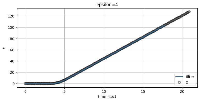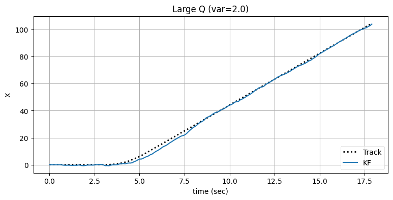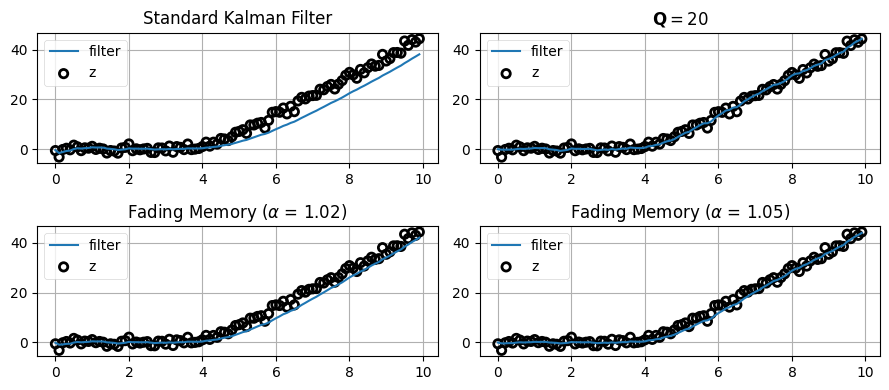 この問題に対する最初のアプローチとして、プロセスノイズ行列 \(\mathbf{Q}\) を大きくして系のダイナミクスの予測不可能性をフィルタに伝えるというのがある。これはフィルタが発散しなくなるという意味で間違ってはいないが、こうすると結果は最適から遠く離れたものになる。\(\mathbf{Q}\) を大きくすると観測値に含まれるノイズが重視された結果となるためだ。この例はすぐ後で見る。