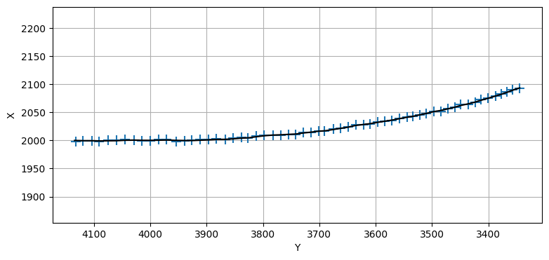 このグラフだとフィルタの性能が確認しにくいので、対象が旋回を開始したときの推定値を確認してみよう。見やすくするため \(x\) 軸と \(y\) 軸を入れ替えた上で拡大したグラフを次に示す。旋回は \(Y=4000\) で始まる。目を凝らして見ると、旋回が始まってから推定値が少し上下に振れているのが分かる。ただフィルタが観測値に遅れることはなく、推定値はすぐに滑らかになる。
