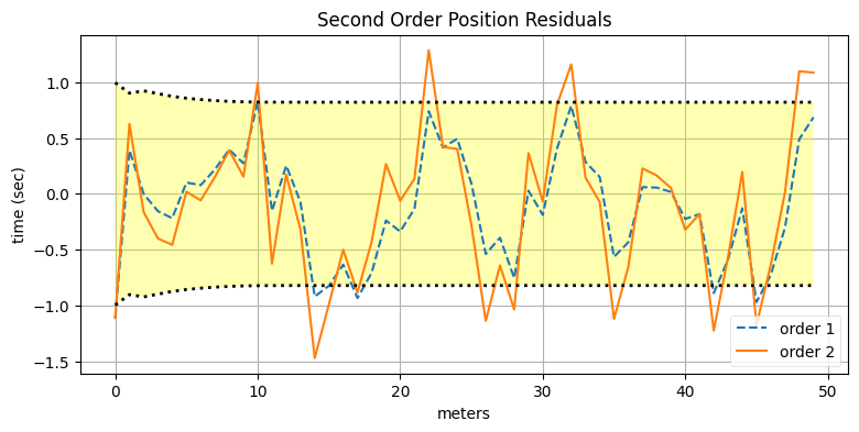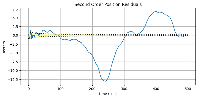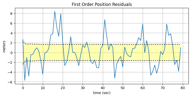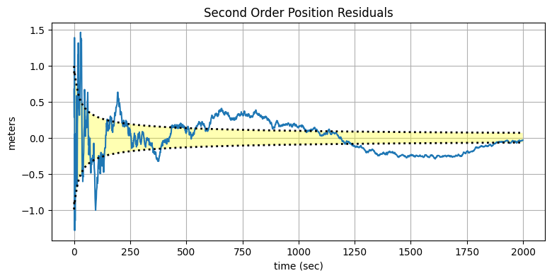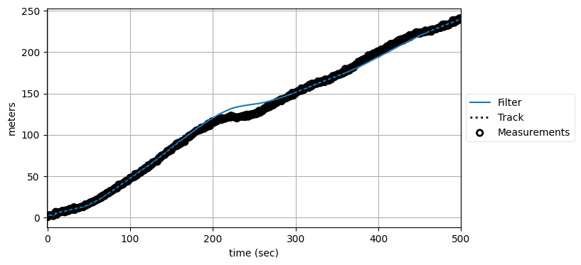 ただそうは言っても、考えている系の小さな非線形性にプロセスノイズで対処することも間違いなく可能である。これはカルマンフィルタの「黒魔術」と言える。センサーと系のモデルが完璧なことは決してない: センサーはガウス分布で表せず、プロセスモデルは正確でない。これは観測ノイズ行列とプロセスノイズ行列を理論的に正しい値よりも大きく設定すれば埋め合わせができるものの、代わりに解は最適でなくなる。フィルタが発散するよりは最適でない解の方が優れているものの、上のグラフに示したように、そのときフィルタの出力は容易にとても悪くなってしまう。また大量に行ったシミュレーションやテストでは非常に良い性能が得られるにもかかわらず、現実世界のデータで条件が少しだけ変わっただけでフィルタの振る舞いが大幅に悪化することも本当によくある。
