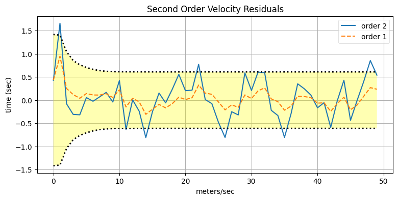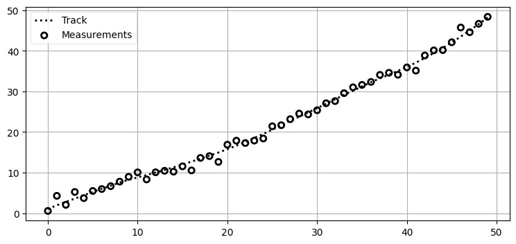 これは正しく見える。直線の傾きが \(\frac{1}{2}\) となっているが、速度を \((2,1)\) にしたので期待通りだ。またデータは \((6,4)\) の近くから始まっているように見える。この動きは現実的とは言えず、いまだに "教科書的な" 問題でしかない。以降で現実的における振る舞いを考慮した様々な条件を加えていく。
