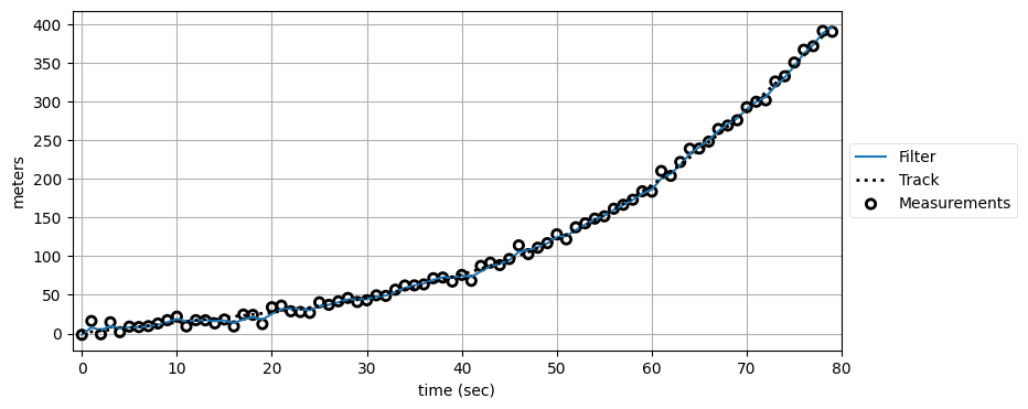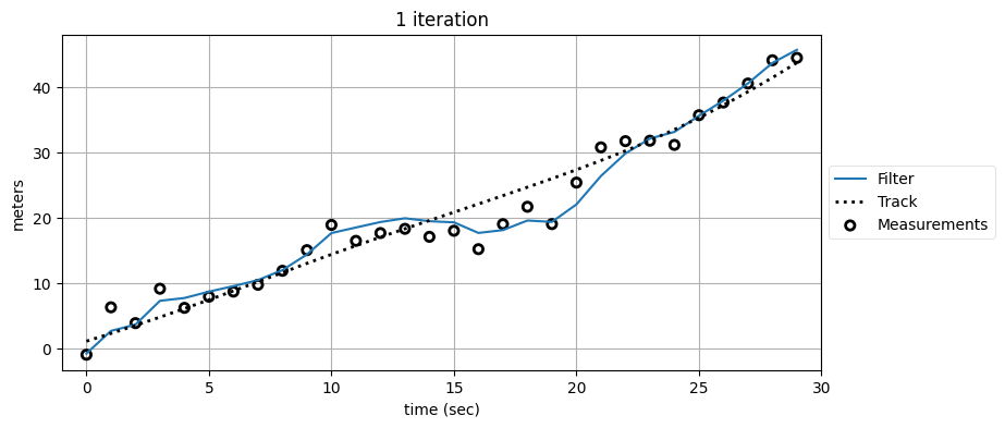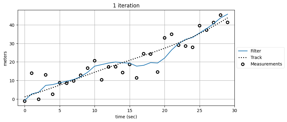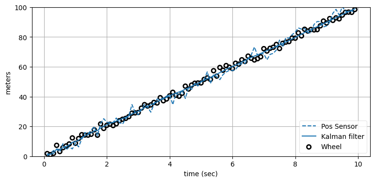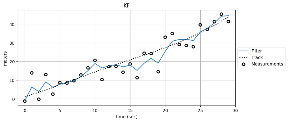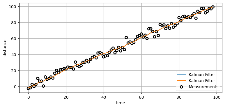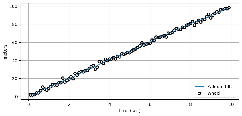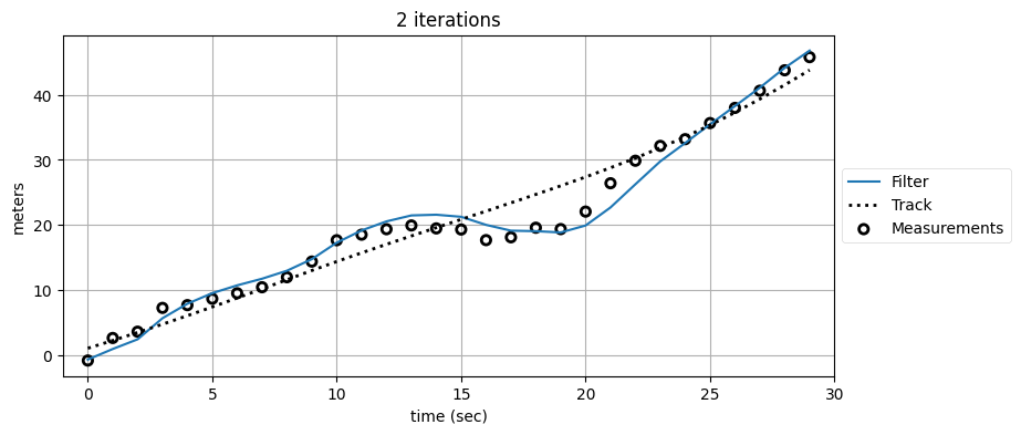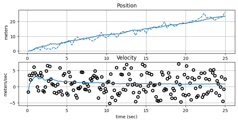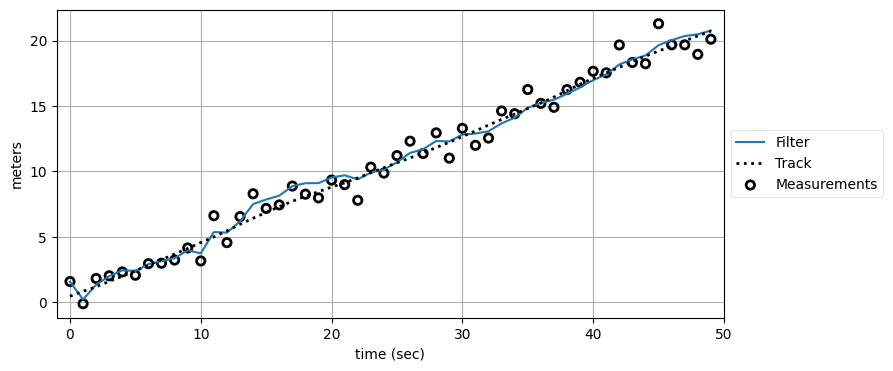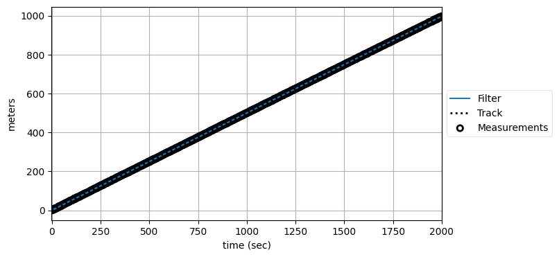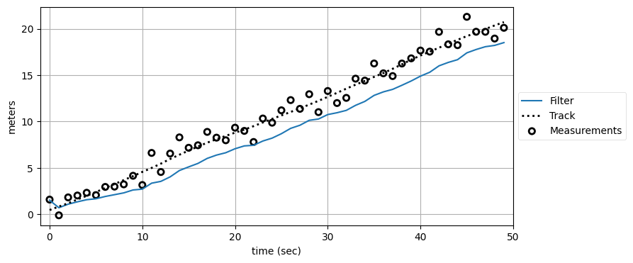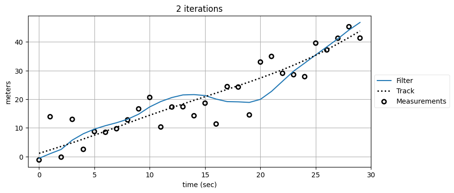 では、これを Python で書いてみよう。とても簡単に書ける: 新しいのは dim_z を 2 に設定する点だけだ: