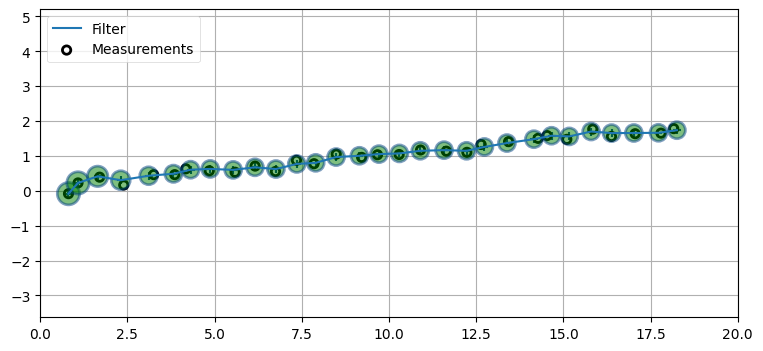 f1 = ball_kf(x, y, theta, v0, dt, r=r, q=q)