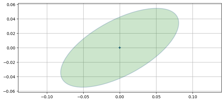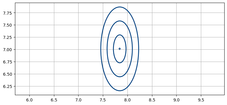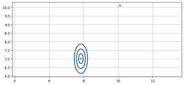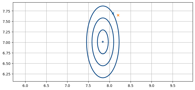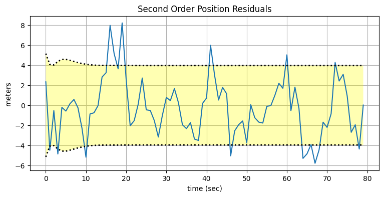 訳注: NEES は真の値を知らないと計算できないので、現実世界の観測値を取得しながらフィルタを実行するときには計算できない。その場合は系不確実性 \(\mathbf{S}\) と残差 \(\mathbf{y}\) を使って \(\mathbf{y}^\mathsf T \mathbf{S}^{-1} \mathbf{y}\) と定義される二乗正規化イノベーション (normalized innovation squared, NIS) を使うと同様の議論でフィルタの性能を評価できる。[return]