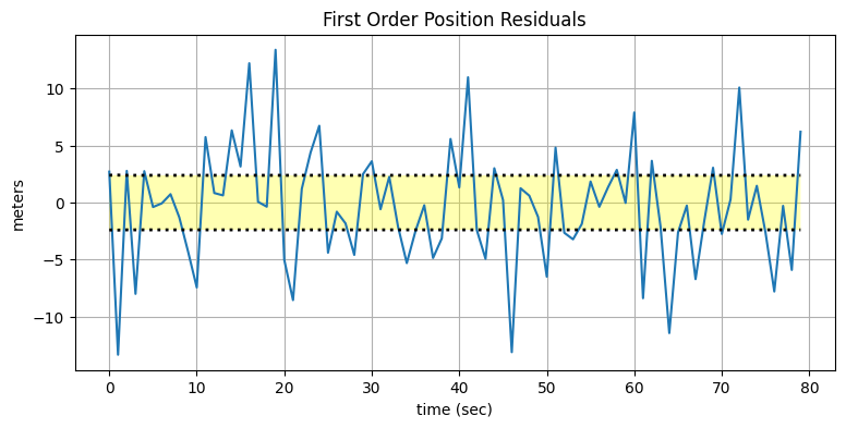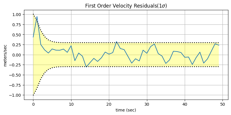 \(\mathbf{Q}\) は FilterPy が計算してくれる。話を簡単にするため、ノイズは離散白色ノイズ (離散化した時刻の間で定数) だと仮定する。この仮定があると、ステップごとにモデルがどの程度変化するかを分散で指定できるようになる。この説明が理解できなかったらプロセスノイズ行列の設計の節を読み直してほしい: