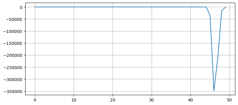 今考えている問題は簡単なので、初期位置は \((0,0)\) に、初期速度は \((0,0)\) に設定する。これは完全な当てずっぽうであることを考慮して、推定値の共分散行列 \(\mathbf{P}\) は大きな値に設定する:
