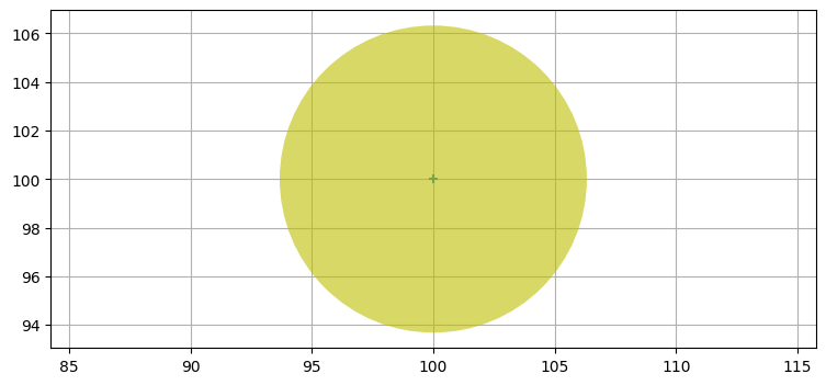 最初に考えるロボット追跡問題はこれまでに考えた一次元空間を移動する犬の追跡問題と非常によく似ている。ここでは廊下における位置を観測するセンサーではなく、二次元空間の位置を観測するセンサーがある。各時刻 \(t\) において、センサーは広場における自身の位置を表すノイズ付き観測値として二次元座標 \((x,y)\) を出力する。