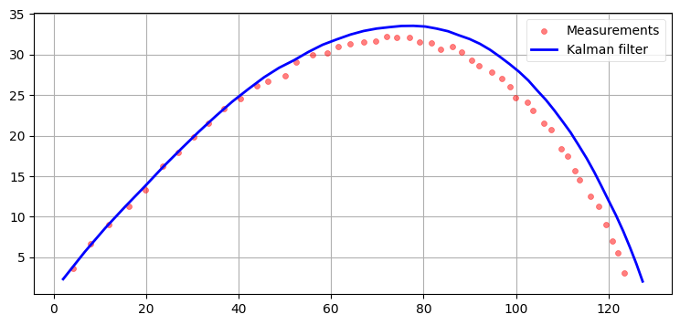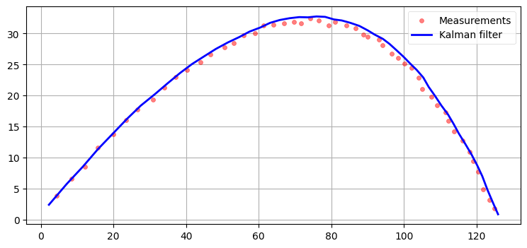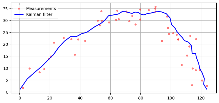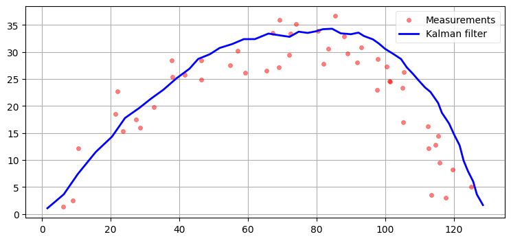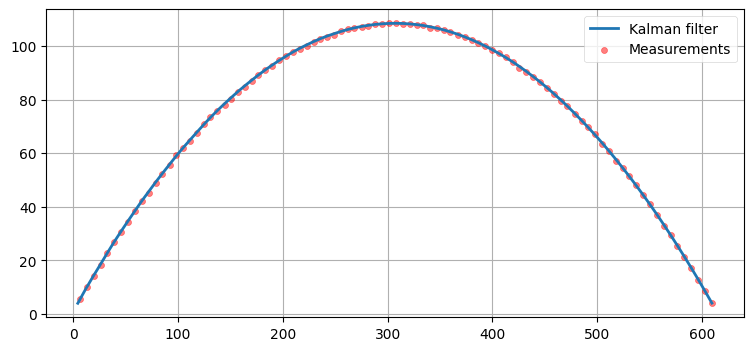 f2 = ball_kf(x, y, theta, v0, dt, r=10.)