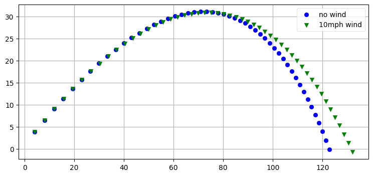 指定したタイムステップと風の速度を使って野球ボールの位置を計算する。