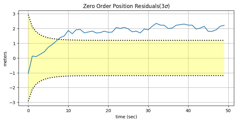 この例ではカルマンフィルタを明らかに誤った問題に適用しているので、今はこの問題をこれ以上は考えない。この問題は次章以降でまた考えて、様々な非線形のテクニックの効果を見ることにする。非線形な問題を線形カルマンフィルタでどうにかできる領域も存在するものの、普通は本書の残りの部分で学ぶ手法のいずれかを使わなければならないはずだ。