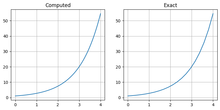 SciPy の linalg モジュールには行列指数を計算する expm 関数が含まれる。この関数はテイラー級数ではなくパデ近似 (Padé approximant) を利用して計算を行う。行列指数の計算方法は多く (最低でも 19 個) 存在し、そのどれもが数値的な問題を抱えている2。特に \(\mathbf{A}\) が大きいときはこの問題に注意する必要がある。"pade approximation matrix exponential" などと検索すればこの問題を論じた文献が多く見つかるだろう。