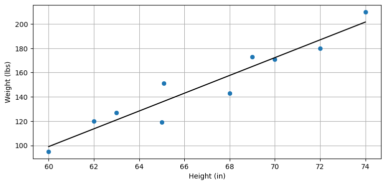 例として、とある学校の陸上チームの身長と体重を考えよう (下図)。データの近くを通るように引かれた直線によると、学生の身長が (例えば) 68 インチなら体重は大体 160 ポンドだろうと予測できる。相関関係は完璧ではないから、この予測も同様に完璧ではない。