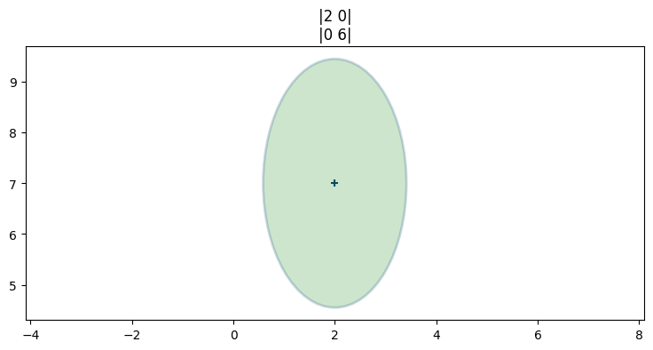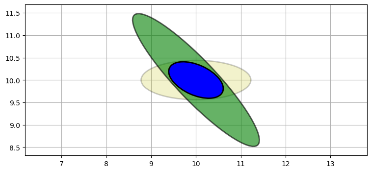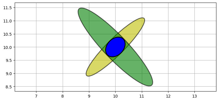二つの楕円が交わる部分で魔法は起こる。この時刻 (位置 5 が観測された時刻) における推定値として考えられるのは予測値の楕円と観測値の楕円が重なる領域しかあり得ない! より正確に言うと、その領域は二つの共分散行列が表すガウス分布の積として前節で示した式で計算できる。ベイズ的な視点で言えば、事前分布と証拠の確率 (尤度) を乗じることで事後分布を計算できる。予測値の共分散行列と観測値の共分散行列をベイズの式で乗じた結果を示す: