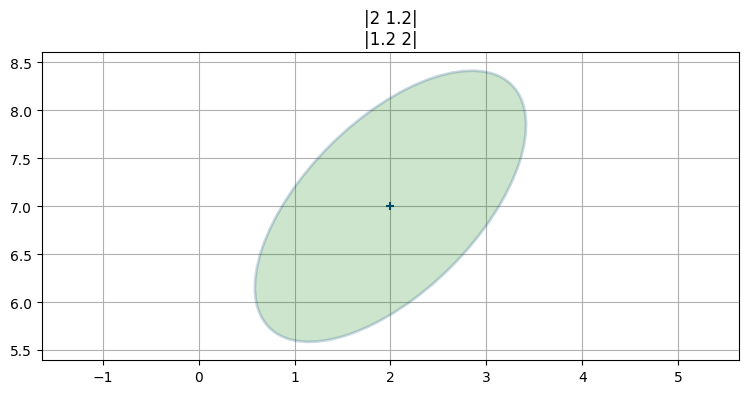 では九次元では? 九次元の楕円を二次元の画面にプロットする方法を私は知らないから、グラフは書けない。それでも考え方は同じである: 分布の平均から標準偏差いくつか分だけ離れた領域は九次元の楕円で記述できる。