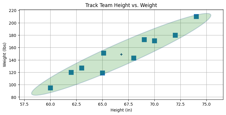 計算された共分散行列から何が分かるだろうか? まず身長の分散が \(0.02~\text{m²}\) で体重の分散が \(261.788~\text{kg²}\) だと分かる。さらに体重と身長に正の相関があることも読み取れる──身長が伸びると体重も増えるようだ。