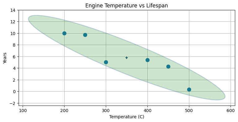 次のコードはエンジン温度と寿命の相関係数を計算する:
