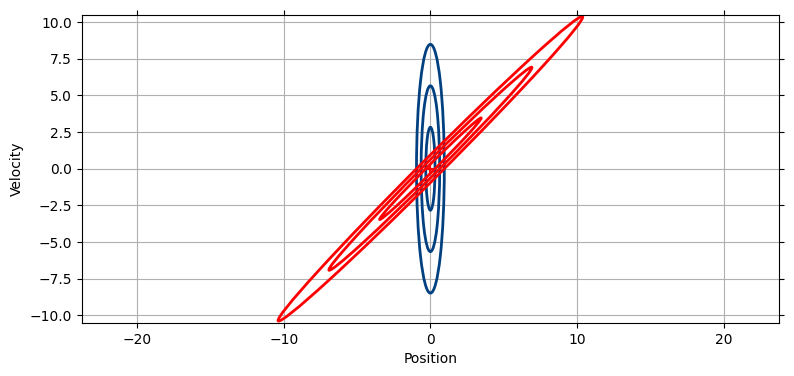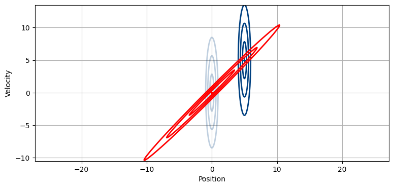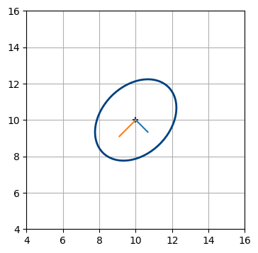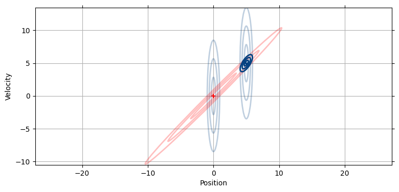 しかし位置と速度には相関がある。もし速度が \(5~\text{m/s}\) なら 1 秒後の位置は \(5~\text{m}\) になり、速度が \(-10~\text{m/s}\) なら 1 秒後に \(-10~\text{m}\) になる。この事実により、一秒後における位置と速度の予測を図示すると、その予測を表す楕円は斜めに傾く: