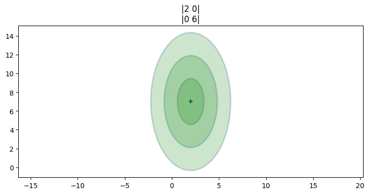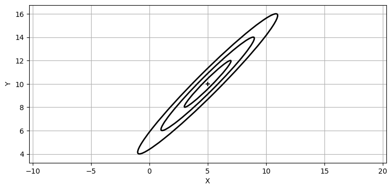犬の現在位置が \((5,\ 10)\) だと信じているとする。この信念の標準偏差が \(x\) 軸方向と \(y\) 軸方向にそれぞれ \(2~\text{m}\) だったとしても、二つの値が強い相関を持つとしたら、共分散行列を示す等高線は次のような形となる: