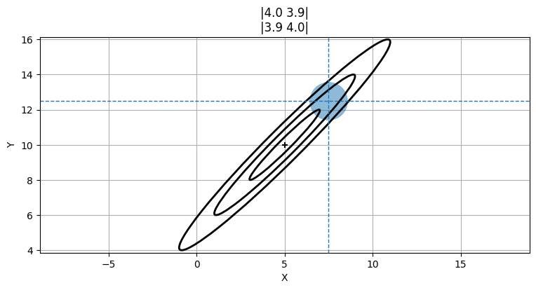 ここで \(x=7.5\) だと分かったと仮定する。ここから \(y\) の値について何が分かるだろうか? 犬の位置は非常に高い確率で共分散行列の \(3\sigma\) を示す楕円の中に入るから、\(X\) と \(Y\) に相関が存在するとき共分散行列を使って \(y\) の位置を推論できる。\(y\) の値として可能性の高い区間を次の図に青い円で示した: