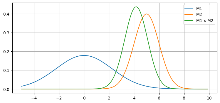 前章ではガウス分布の積を計算することで不正確な観測値と不正確な推定値を組み合わせた。ガウス分布の確率密度関数を二つ乗じて正規化を行うと、小さい分散を持つガウス分布の確率密度関数が手に入る。不正確な二つの情報を組み合わせて得られる結論は、組み合わせる前の情報より高い正確さを持つはずだ。これを次のグラフに示す:
