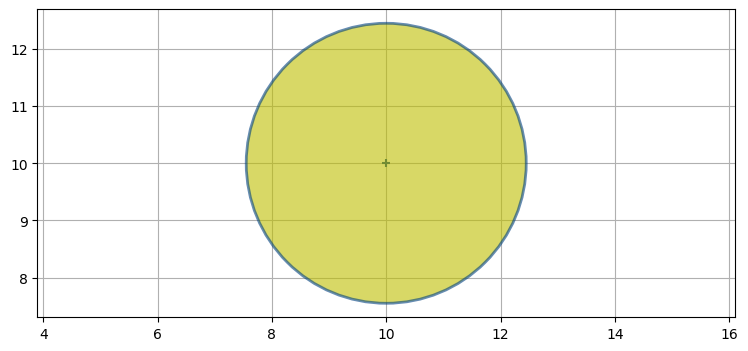 plot_covariance_ellipse((10, 10), P2, ec='k', fc='y', alpha=0.6)