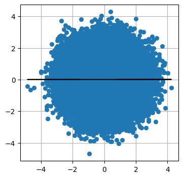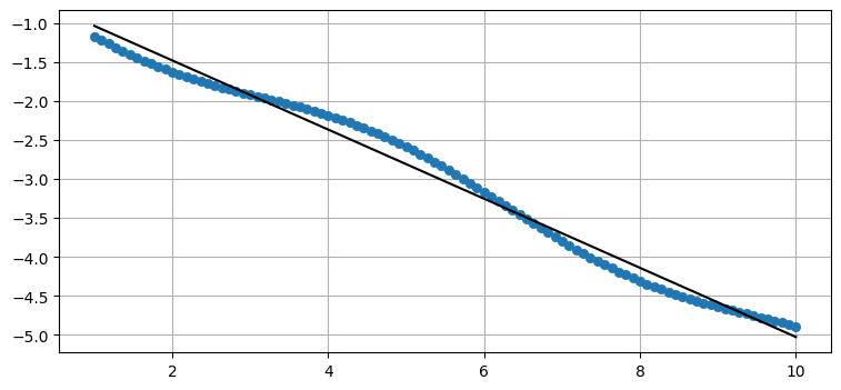 データ (青丸) は直線にならない。ただ共分散 \(\sigma_{xy}=-3.08\) は \(\sigma_x^2\) や \(\sigma_y^2\) と比べて絶対値が同程度なので、高い相関があると分かる。これはグラフを見ても分かる: データは直線に非常に近い。