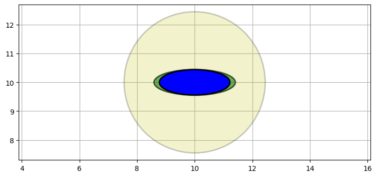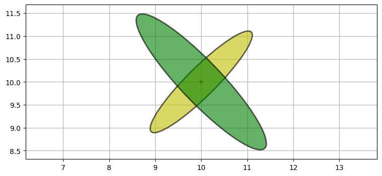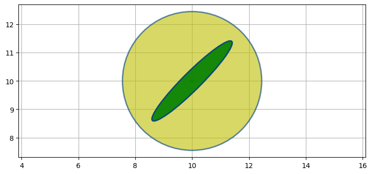 plot_covariance_ellipse((10.1, 9.97), P2, ec='k', fc='g', alpha=0.6)