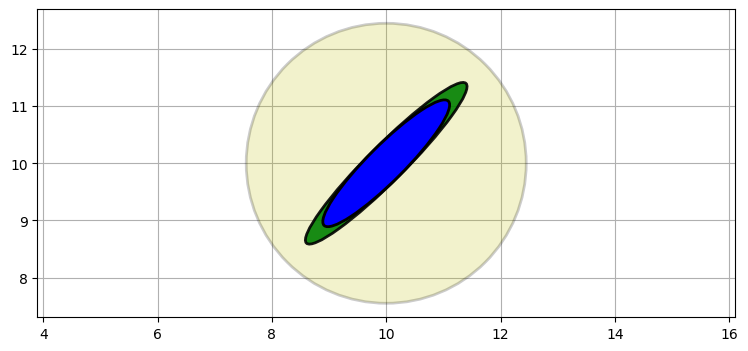 航空機の左下にレーダーがあると仮定し、さらに方位の観測値は正確で、距離の観測値は不正確とする。このとき観測値に含まれる誤差の共分散行列は次のような形になる (黄色の上に緑色でプロットしている)。ベイズ統計ではこれを証拠と呼んでいた: