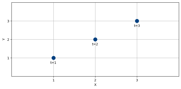 航空機を追跡していて、時刻 \(t=1,\ 2,\ 3\) 秒で \(x\) 座標と \(y\) 座標が次の通りだったとする。このとき \(t=4\) 秒における \(x\)の値はいくつになると直感的に考えるだろうか?