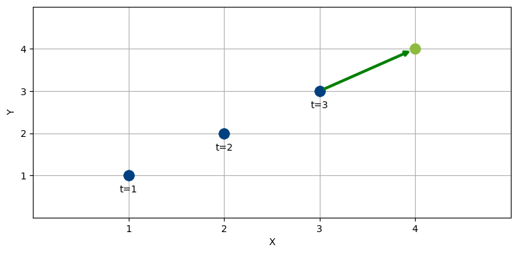 航空機は直線的に飛行しているように見え、そして航空機は急に進行方向を変えられないことを私たちは知っている。よって最も理にかなった推定は \(t=4\) で航空機が \((4,\ 4)\) にいるというものだ。次の図に緑色の矢印で示す: