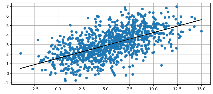 \(X\) と \(Y\) の相関が弱くなったために、共分散が分散と比較して小さくなったのが分かる。データにフィットする直線は引けるものの、データの変動はずっと大きくなった。