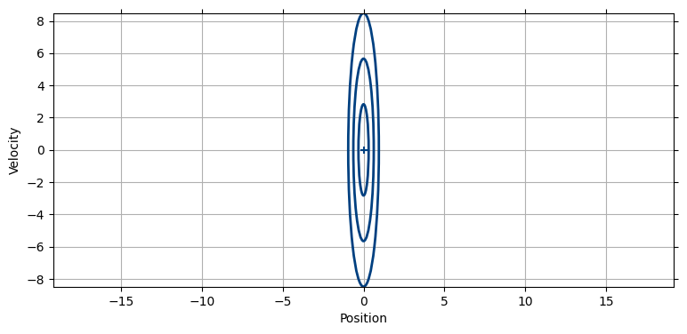 最初の時刻において私たちは位置に関して \(x=0\) だとかなり正確に知っていて、速度に関してはほとんど何も知らないと仮定する。この信念を共分散行列と共に次の図に示す。横方向の幅が狭いのは位置に関する確かさが比較的高いことを表し、縦に長いのは速度に関する知識が欠けていることを表す:
