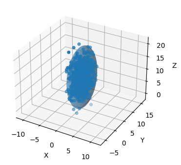 高次元のガウス分布はどんな見た目だろうか? 二次元のガウス分布は誤差を表す楕円で図示できたから、三次元のガウス分布は誤差を表す三次元の楕円体で図示できると考えるのが自然だろう。ここで数学的なことを掘り下げはしないが、この考えは正しいと示せる。FilterPy はこの楕円体をプロットする関数を提供する。