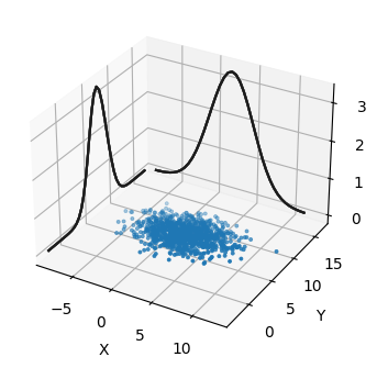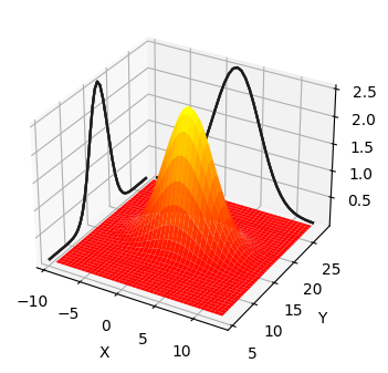 これは平均 \(\mu=\Big[\begin{smallmatrix}2\\17\end{smallmatrix}\Big]\) と共分散行列 \(\Sigma=\Big[\begin{smallmatrix}10&0\\0&4\end{smallmatrix}\Big]\) を持つ多変量正規分布のプロットである。三次元の形状が任意の \((X, Y)\) の組に対する確率密度を \(z\) 軸方向の高さとして表す。グラフの側面には \(X\) または \(Y\) だけを考えたときの確率分布が投影してあり、その曲線はガウス分布の釣鐘曲線になっているのが分かる。\(X\) だけを考えた曲線の幅が \(Y\) だけを考えた曲線より広いのは \(\sigma_x^2=10\) と \(\sigma_y^2=4\) によって説明できる。三次元曲面が最も高くなるのは \(X\) と \(Y\) が平均となる点である。