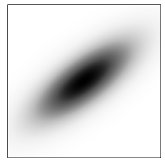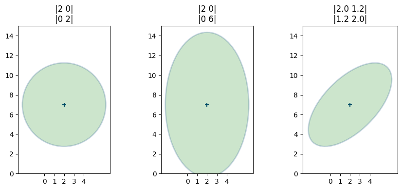 続いて分散の表現が必要である。一見すると、平均と同じく \(N\) 次元の正規分布には \(N\) 個の分散が必要だと思うかもしれない。つまり \(x\) と \(y\) の分散がそれぞれ \(10\) と \(4\) のとき、次のように分散を表すということだ: