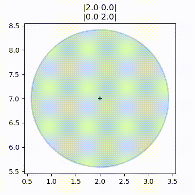 次は具体例を使って多変量ガウス分布の積を見ていこう。二つのレーダーを使って航空機を追跡しているとする。高度は無視して二次元座標だけを考え、レーダーはターゲットの距離と方位を報告すると仮定する。航空機の初期位置は分からないので、共分散行列 (つまり位置の不確実性) は例えば次のようになるだろう。ベイズ統計の用語を使えば、これが事前確率である:
