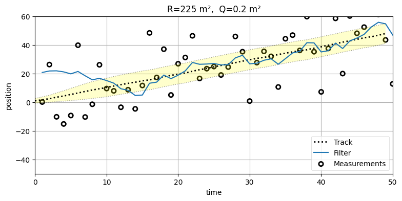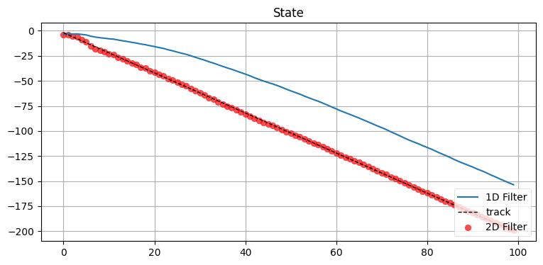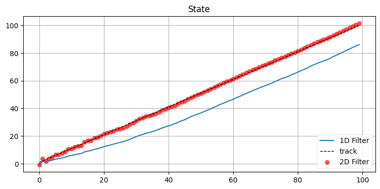 後半の章では非線形性という問題に取り組む。今の段階では線形フィルタで使う行列の設計が数学というよりも実験に近い手続きであることを理解してほしい。最初に値を求めるのには数学を使うものの、その後は実験が必要になる。世界にモデルに入っていないノイズ (風など) が多くあるなら、\(\mathbf{Q}\) を大きくしなければならないだろう。しかし大きくしすぎると、今度は入力の変化に素早く反応できなくなる。適応フィルタの章では入力と性能に応じたフィルタ設計のリアルタイムな変更を可能にする手法を学ぶ。しかし今の段階では、フィルタが遭遇するどんな条件でも動作する値を見つけるしかない。アクロバット飛行機に対するノイズ行列は生徒が操縦するときとベテランが操縦するときでは異なるかもしれない。系のダイナミクスが大きく異なるためだ。