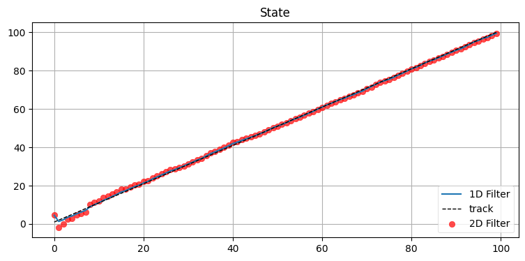 - \(\mathbf x,\, \mathbf P\) は状態を表す多変量ガウス分布の平均と共分散行列であり、それぞれ \(x\) と \(\sigma^2\) に対応する。