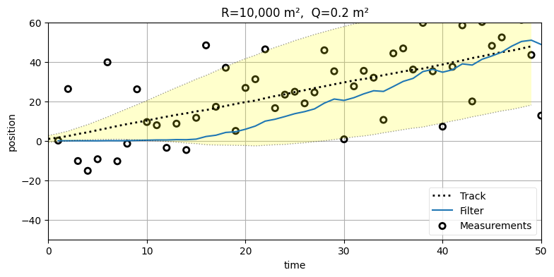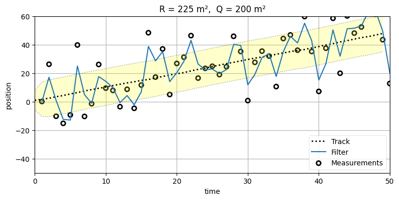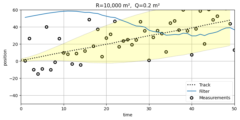 巨大な観測誤差を設定してどうなるかを見よう。\(R=200\, \text{m}^2\) と設定するので、どうなるか考えてから結果を見てほしい: