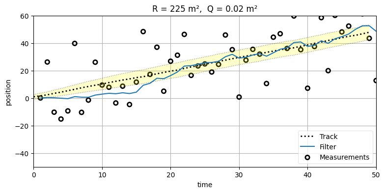 f = pos_vel_filter(x=(0., 0.), R=3., Q=.02, P=P)